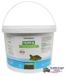 ТЕРРА — специализированный корм в виде плавающих гранул для водных черепах. Корм изготовлен по современной экструзионной технологии из натуральных высококачественных продуктов животного и растительного происхождения. Содержит водоросли, комплекс витаминов и минералов, стабилизированную аскорбиновую кислоту. Специальные минеральные и органические добавки (экстракт из моллюсков, хитозан, соли кальция) укрепляют иммунитет и способствуют сохранению скелета и панциря Ваших питомцев.